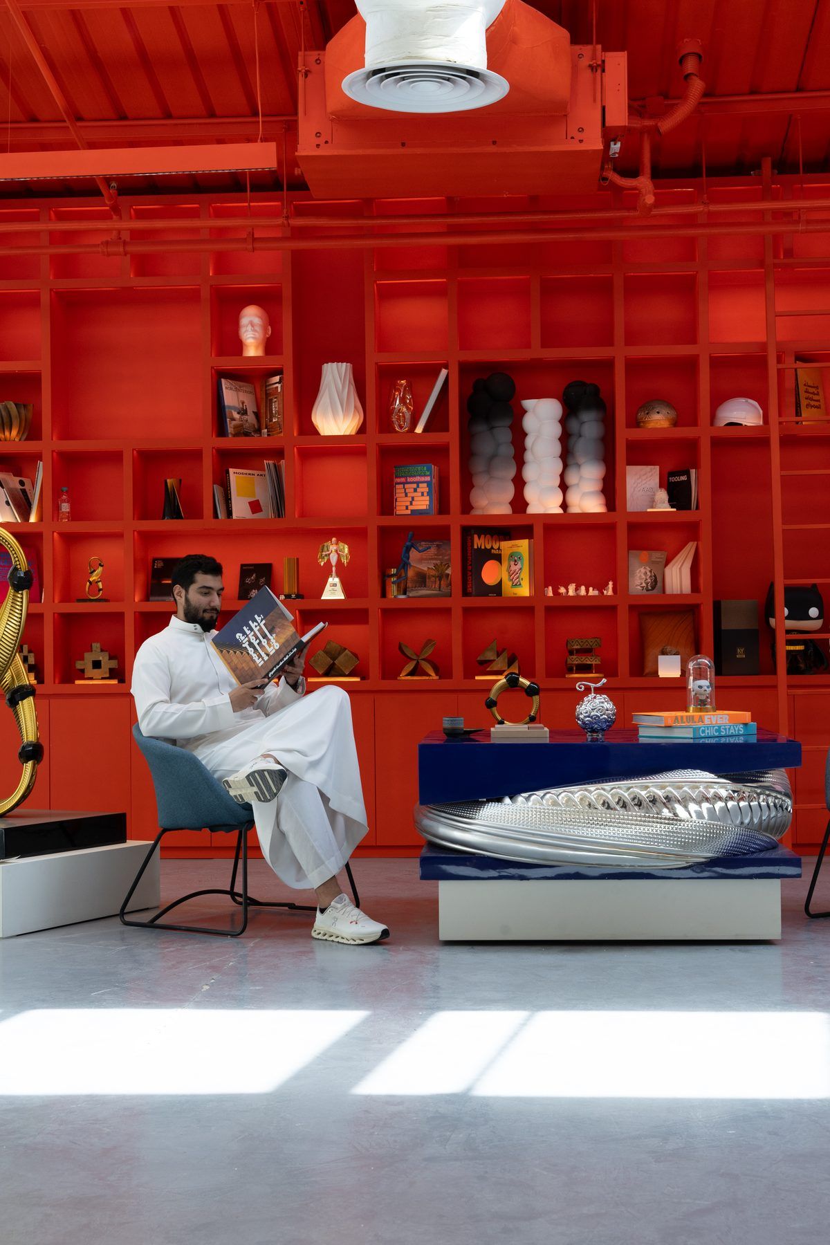 His practice spans painting, sculpture, furniture design, and architectural installations — united by a deep reverence for material, form, and the desert landscape that shaped his early imagination. Each piece begins as a meditation on memory: the texture of wind-carved sandstone, the geometry of Najdi architecture, the silence of empty quarters at dusk.